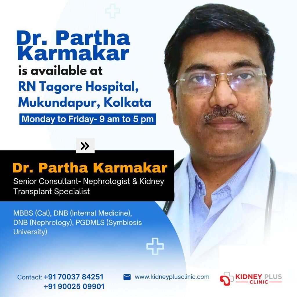 Dr. Partha Karmakar, Nephrologist & Kidney Transplant specialist, is now available for consultation at RN Tagore Hospital, Mukundapur.<br>For expert care in nephrology and kidney transplant, book your appointment today!<br>Schedule: Monday to Friday- 9am to 5pm.<br>For Appointment, Call: +91 70037 84251<br>π Call: 9002509901<br>π <a href="https://www.kidneyplusclinic.com">www.kidneyplusclinic.com</a>