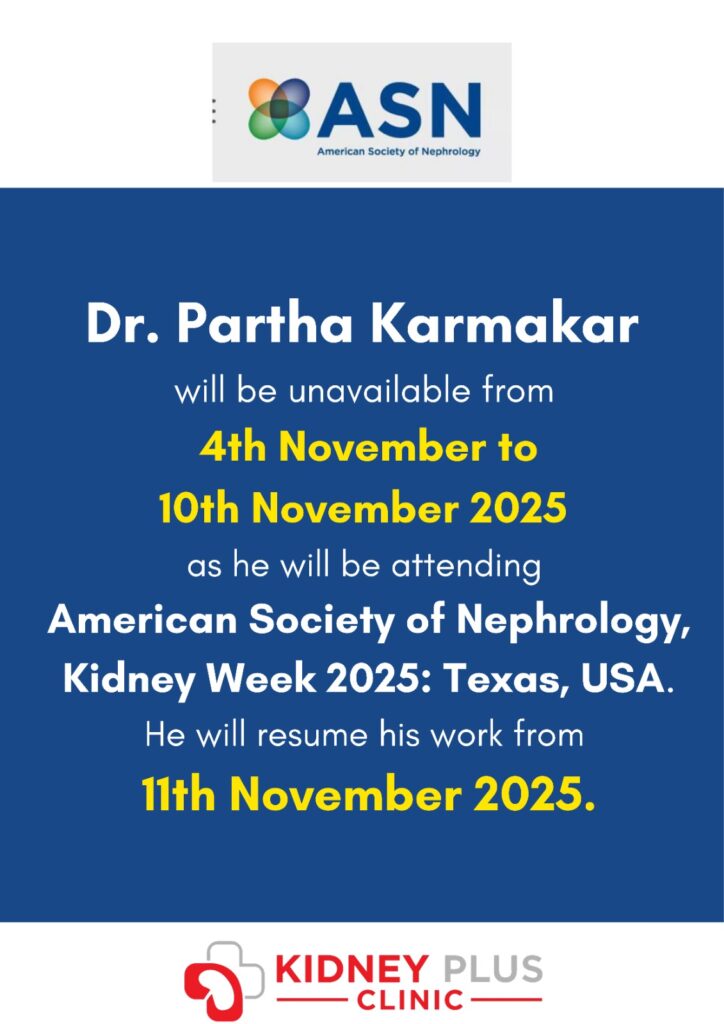 • Dr. Partha Karmakar will be unavailable from 4th November to 10th November 2025, as he will be attending American Society of Nephrology, Kidney Week 2025: Texas, USA.